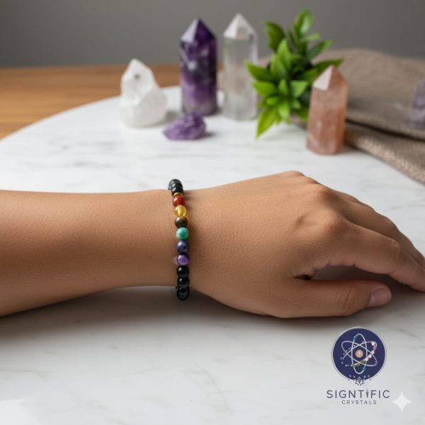 The bracelet shown is a 7 Chakra and Magnetic Hematite bracelet. The purported benefits associated with wearing such a bracelet are primarily related to holistic wellness, energy balance, and physical well-being.